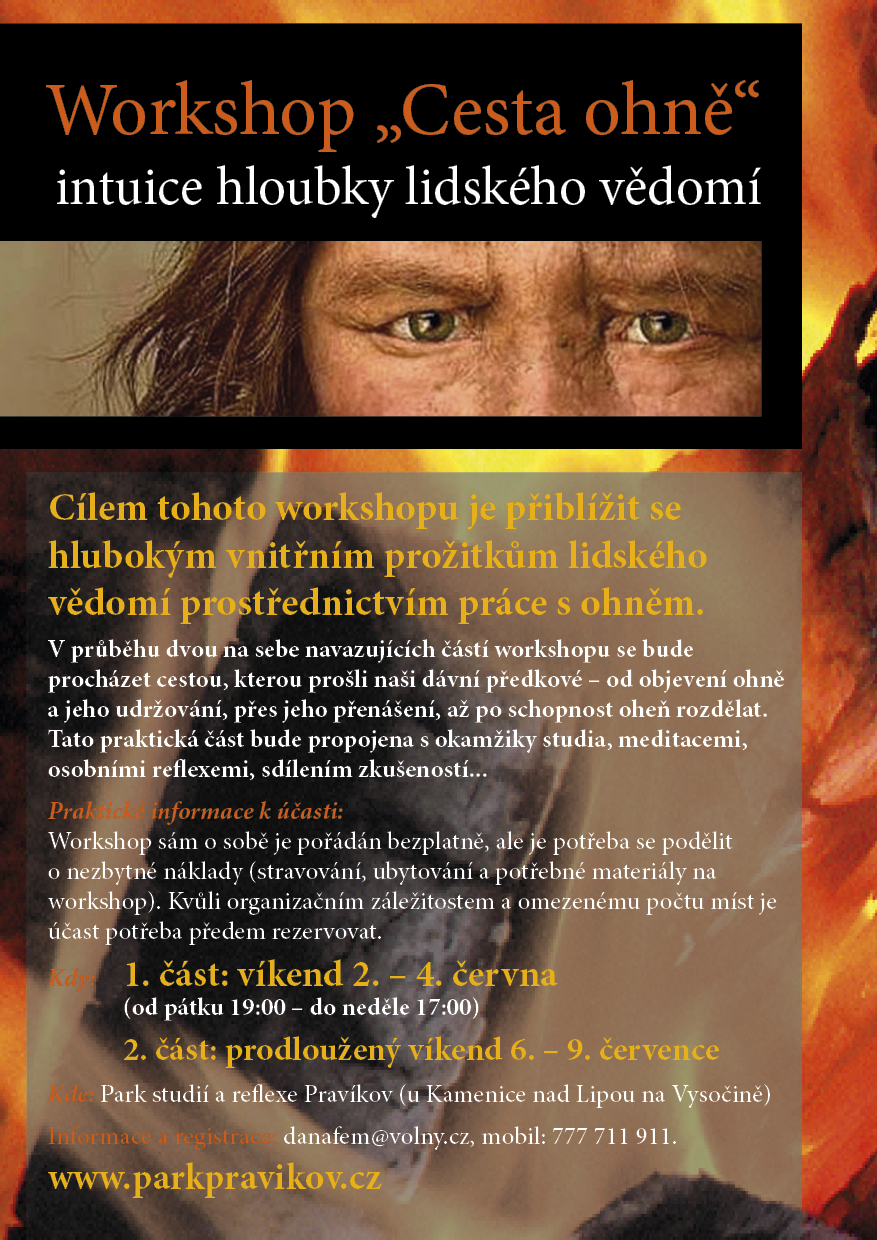 V průběhu workshopu se bude procházet cestou, kterou prošli naši dávní předkové – od objevení ohně a jeho udržování, přes jeho přenášení, až po schopnost oheň rozdělat. Tato praktická část bude propojena s okamžiky studia, meditacemi, osobními reflexemi, sdílením zkušeností…