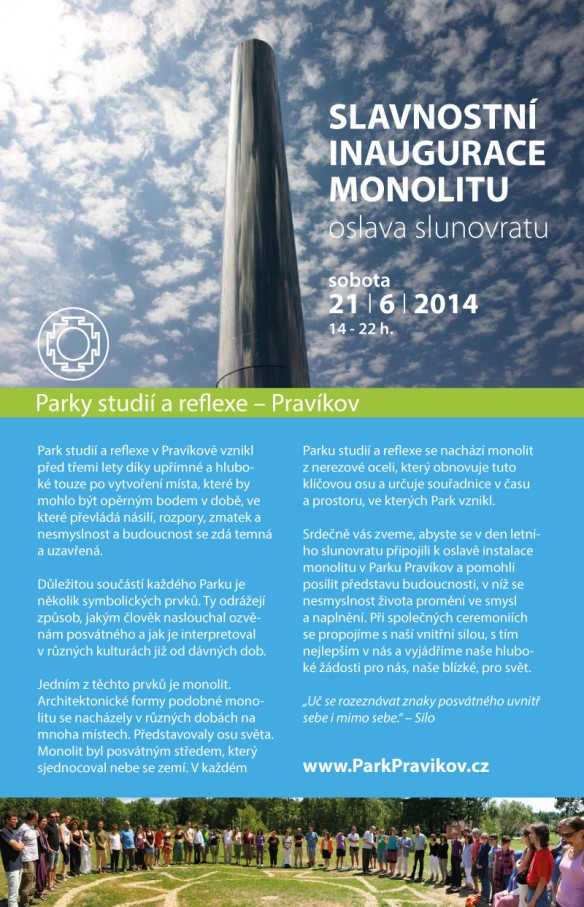 Srdečně vás zveme, abyste se v den letního slunovratu připojili k oslavě instalace monolitu v Parku Pravíkov a pomohli posílit představu budoucnosti, v níž se nesmyslnost života promění ve smysl a naplnění. Při společných ceremoniích se propojíme s naší vnitřní silou, s tím nejlepším v nás a vyjádříme naše hluboké žádosti pro nás, naše blízké, pro svět.